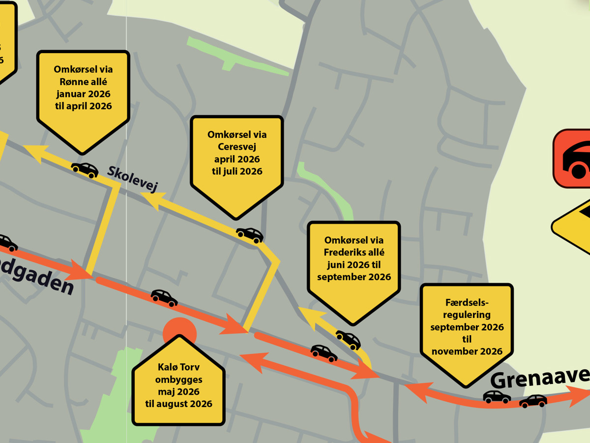 I perioden hvor Hovedgaden i Rønde renoveres, kan der forekomme udfordringer mht. halmlevering til Rønde Fjernvarme. Hermed kort over perioder hvor der er spærret på forskellige strækninger på Hovedgaden.
