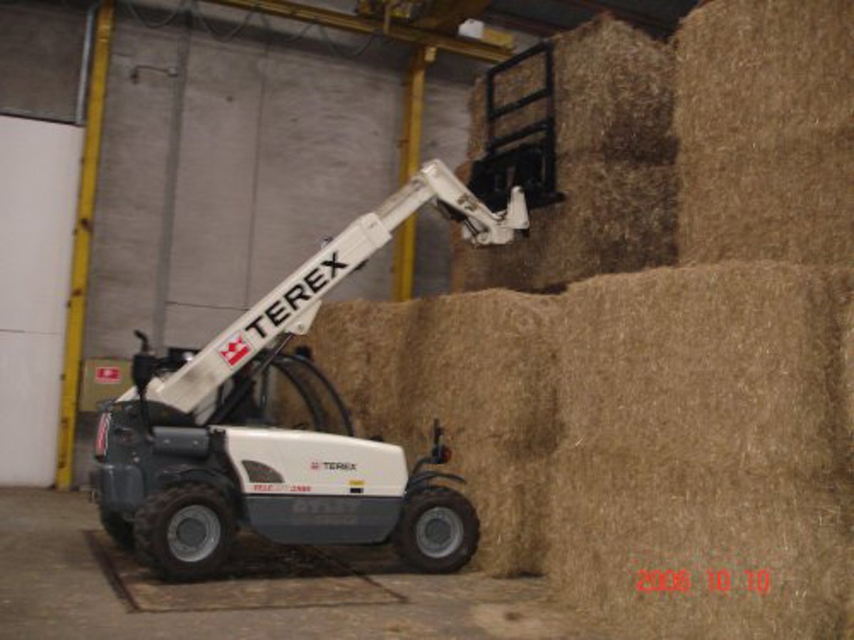 Halmballerne køres herefter til "fødegangen", hvor en kran automatisk fra 4 baner løfter ballerne over til halmfyret.