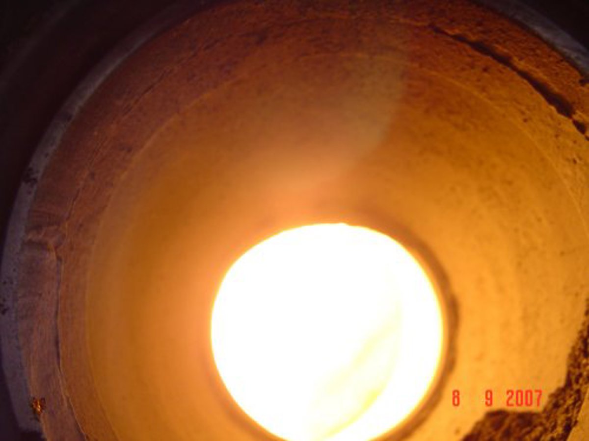 Den fuldstændige forbrænding set gennem skueglas på toppen af kedlen.